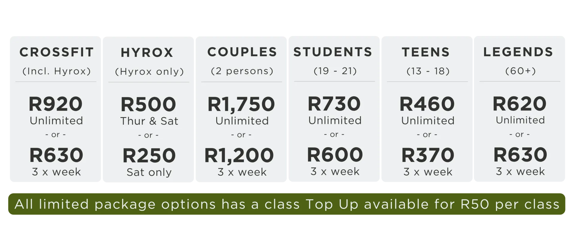 We also have a “Top Up As You Go” option for only R100 per session. For affordable fitness to suit your needs as well as your pocket, we’ve got you covered.